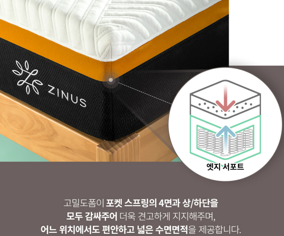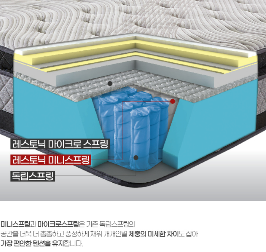 인체 굴곡에 맞게 2가지 종류의 강선을 사용한 7존 독립 스프링과 미니스프링 및 마이크로스프링이 체중의 미세한 차이도 잡아 편안한 텐션을 유지하게 한다. 현재 매트리스 구매 시 이벤트 상품을 증정하므로 홈페이지를 참고해주시길 바랍니다.
