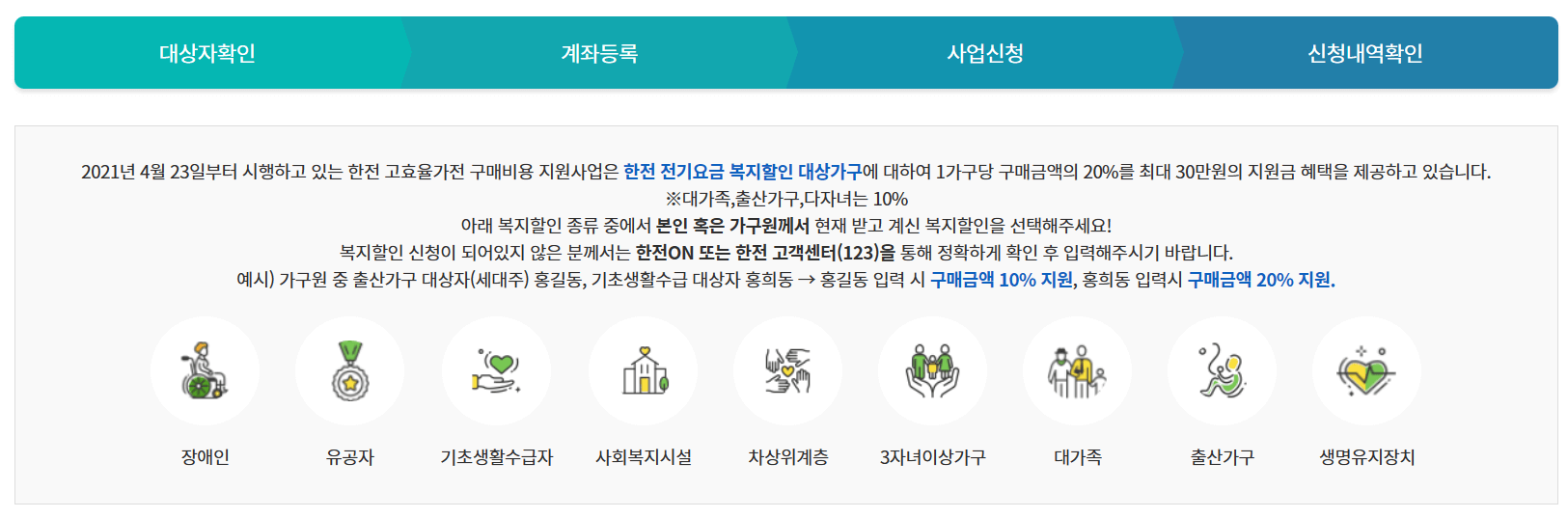 구역전기사업자로부터 전기공급을 받고 있는 세대는 해당 지역 사업자에 신청 문의 해주시길 바랍니다.